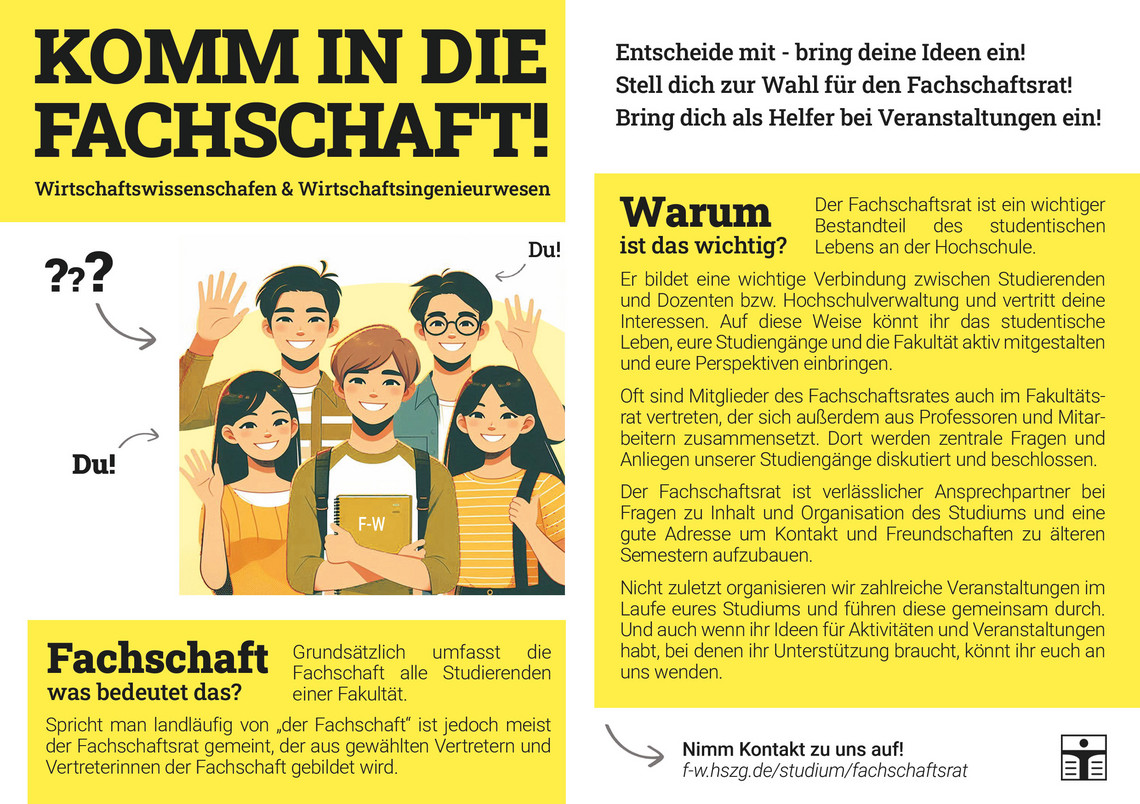 Die Mitglieder der Fachschaft vertreten mit Hilfe des Mitbestimmungsrechts die Interessen der Studenten/innen bei Entscheidungen der Hochschule.